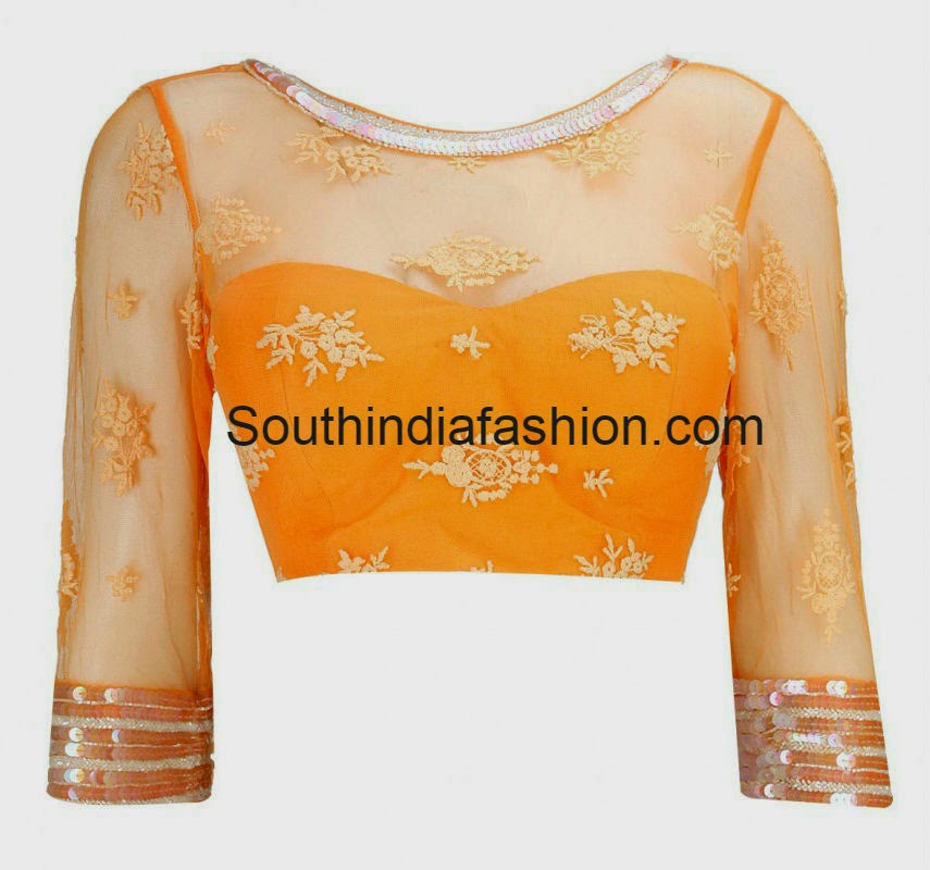 Indian FashionLatest Blouse DesignsNet saree BlouseUncategorized Chic and Stylish Latest Blouse Design By southindiafashion - Sep 11, 2014 Orange net embellished blouse with sheer neck line and sleeves.
