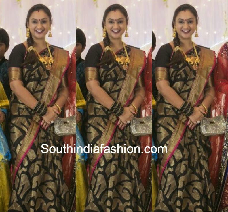 Bridal SareesIndian FashionUncategorized Preetha in Traditional Saree By southindiafashion - Nov 12, 2014 Preetha Vijaykumar attended Atlee and Priya engagement event wearing a black and gold traditional saree. She looked good.