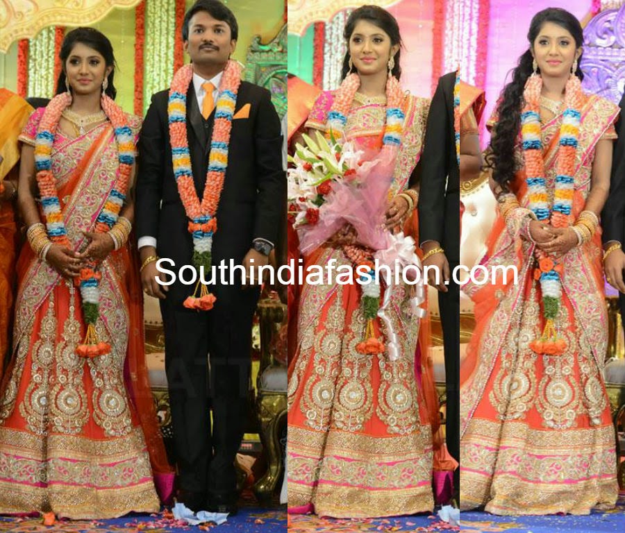 Raj TV director M.Ravindran daughter Dr.Manipriya’s wedding reception was held in Chennai. For the reception Manipriya wore a gorgeous orange and pink combination bridal lehenga featuring intricate gold embroidery all over teamed up with pink designer blouse. She looked stunning!