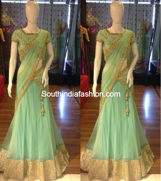 Aurum StudioHalf SareesIndian FashionTeen FashionUncategorized Elegant Mint Green Half Saree By southindiafashion - May 7, 2015 Elegant mint green lehenga with gold sequins border and mint green net dupatta with sequins border paired with matching boat neck blouse by Aurum Studio. For price inquiries whatsapp: 9000016048 Studio Address: Banjara Hills Road no. 4 Hyderabad