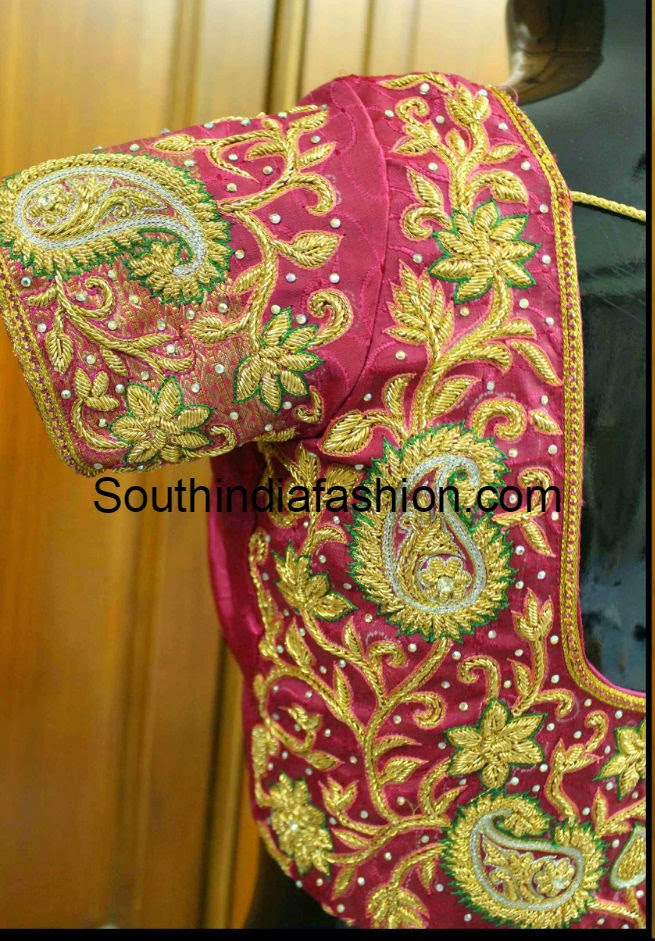Tags: blouse designs for pattu sarees, heavy work blouse, full work blouse designs, kanjeevaram saree blouse designs, bridal saree blouse, zardosi work blouse designs