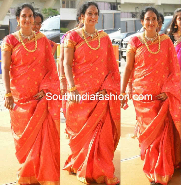 Celebrity SareesIndian FashionKanjeevaram SareesUncategorized Krishnam Raju Wife at Manchu Manoj Wedding By southindiafashion - May 20, 2015 Actor Krishnam Raju’s wife attended Manchu Manoj’s wedding in orange color kanjeevaram saree that has gold bhutis all over and gold border paired with matching short sleeves blouse.