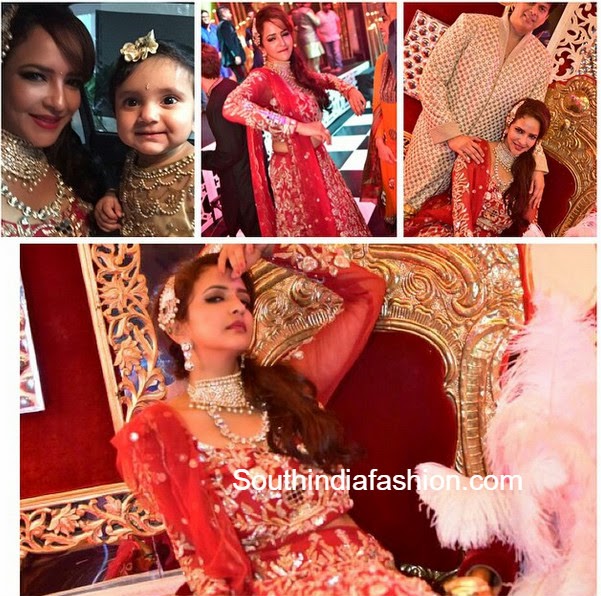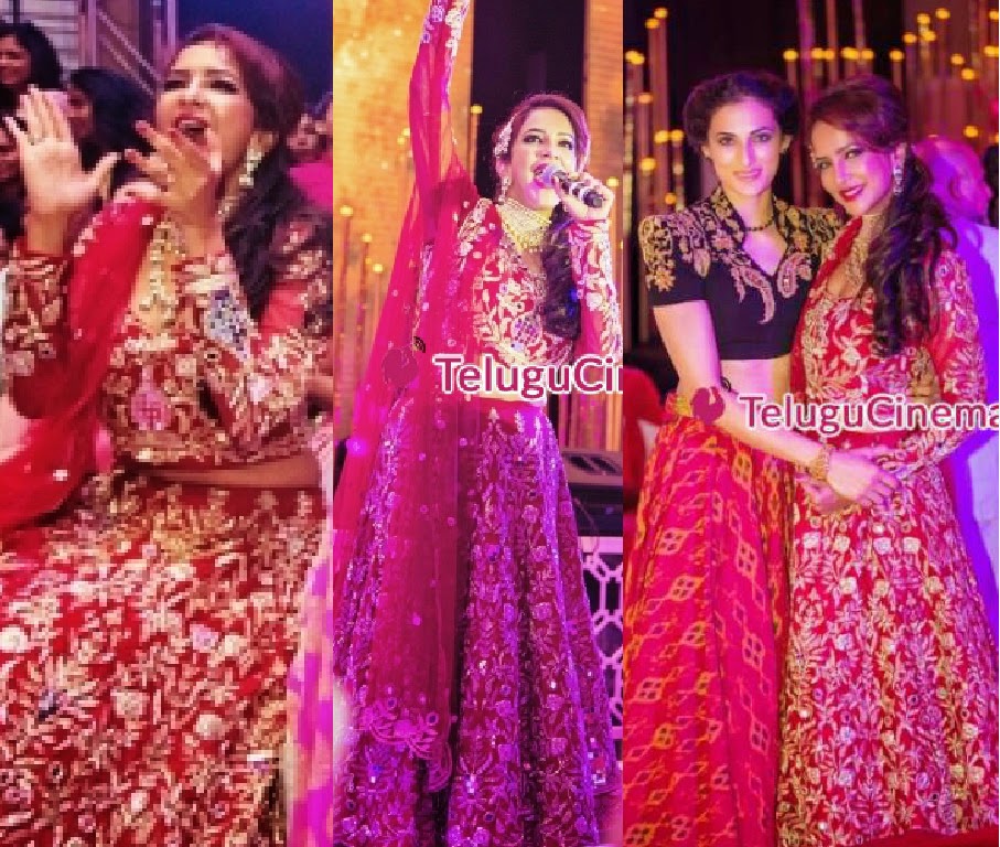 At Manchu Manoj’s Sangeeth ceremony, Lakshmi Manchu was spotted in a red embellished lehenga paired with polki diamond jewellery.