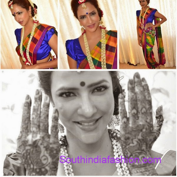 For Mehendi ceremony, she wore Tarun Tahiliani checkered silk saree paired with blue puff sleeves blouse.