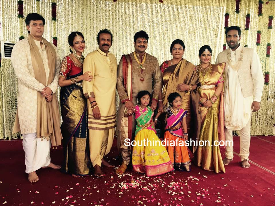 Manoj looked royal in a brown sherwani teamed with a gold long necklace. Lakshmi Manchu looked stunning in Gaurang Shah blue and gold kanjeevaram saree paired with contrast red elbow length sleeves embellished blouse and polki diamond jewellery.