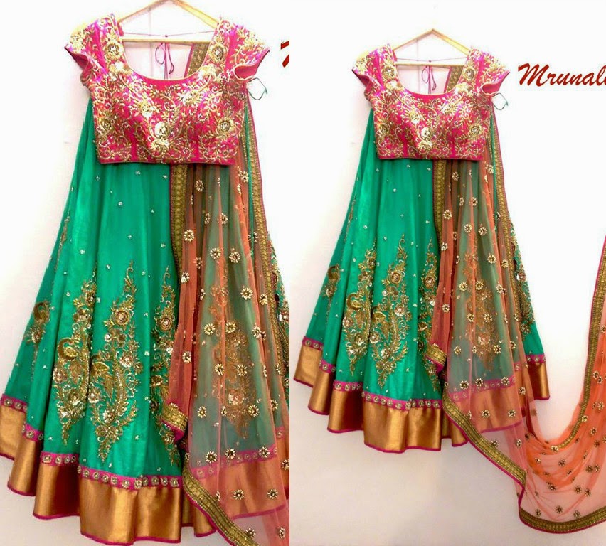 Stunning peacock bridal half saree by Mrunalini Rao featuring green lehenga with gold peacock embroidery and gold border paired with peach embellished dupatta and pink full work designer blouse .