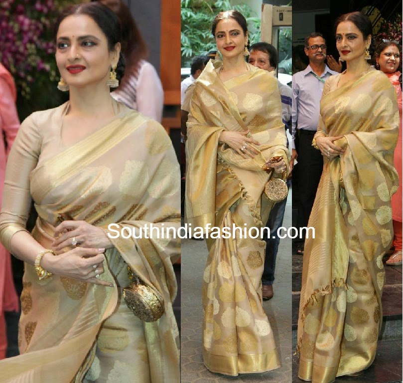 Actress Rekha attended Dadasaheb Phalke Award presentation event wearing a gold color kanjeevaram silk saree paired gold with three quarter sleeves high back neck blouse. Gold jhumkis, bangle and gold potli bag finished out her look. She looked stunning!!