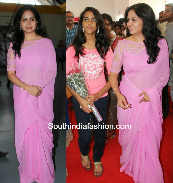 Singer Sunitha launched a Kids Fair at Hyderabad along with her daughter. For the event she wore a plain pink georgette saree paired with embroidered net elbow length sleeves boat neck blouse that has transparent neckline and sleeves. She looked nice!