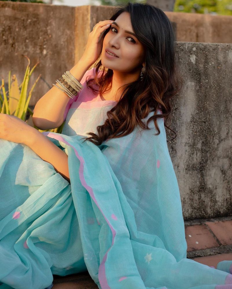 Vani Bhojan has a penchant for graceful ethnic wear. Subtle hues, comfortable fabric and elegantly beautiful – these are the perfect descriptions for her traditional wardrobe. Her latest pick checked all these boxes. It was a lovely linen-cotton saree in the beautiful shades of blue and pink. And Vani looked absolutely dreamy in that. Keep scrolling to see her look in detail.